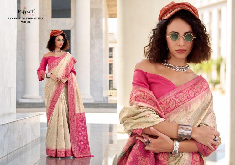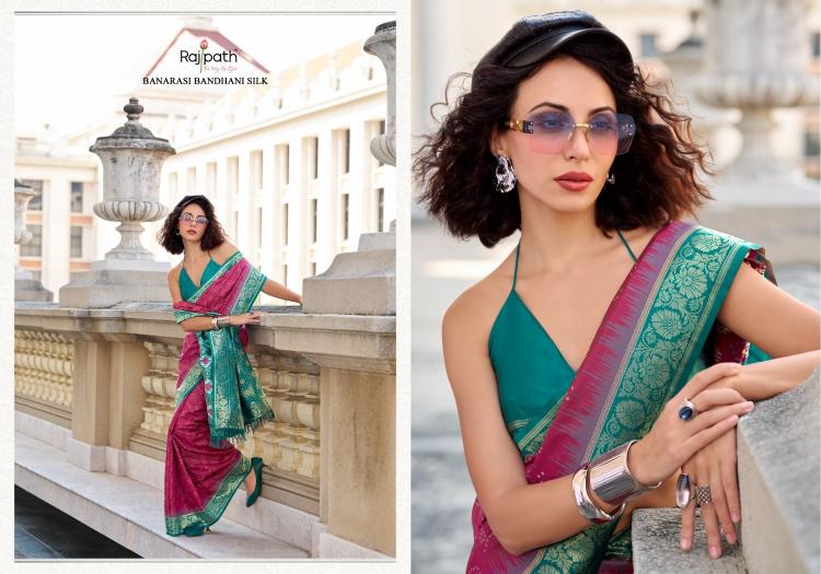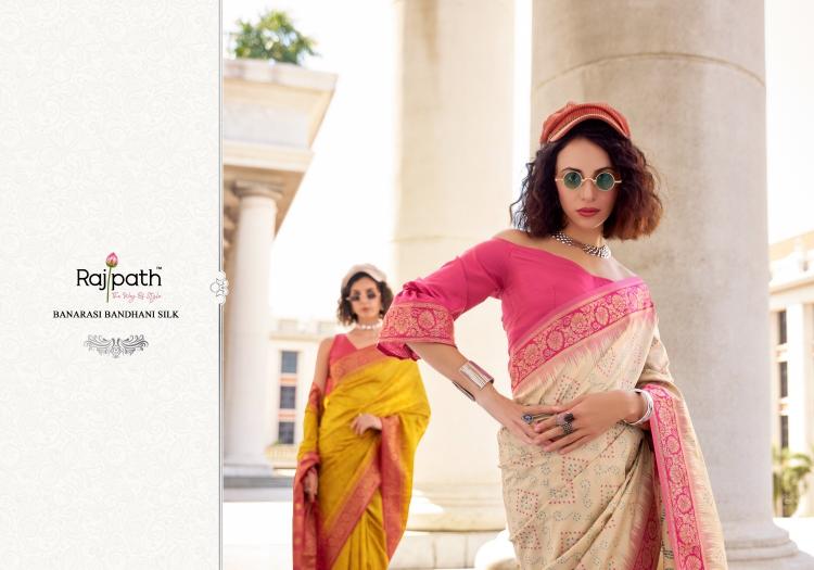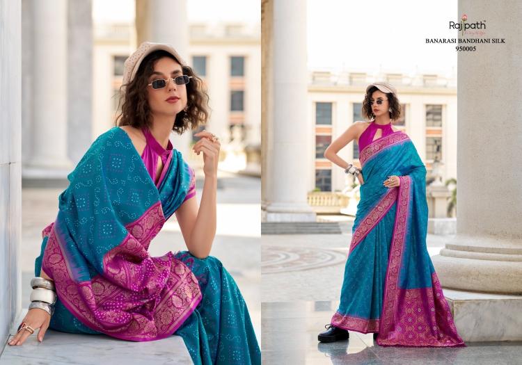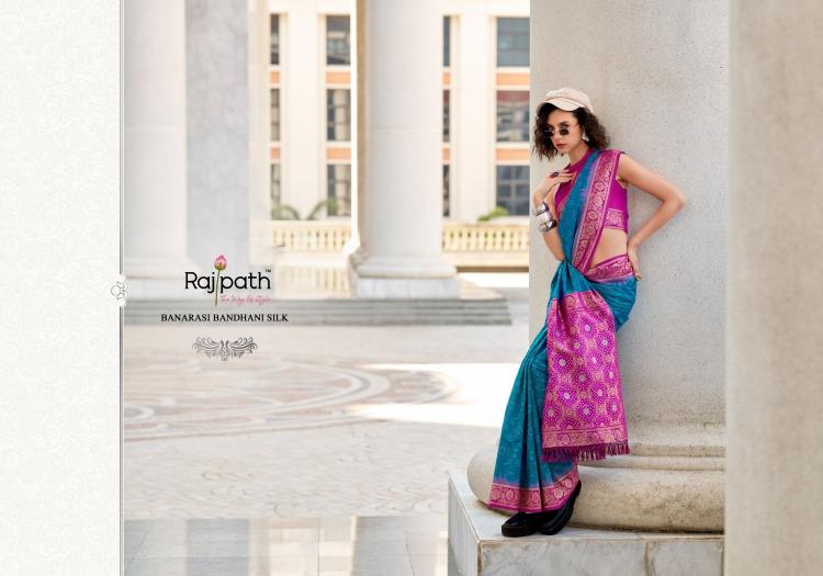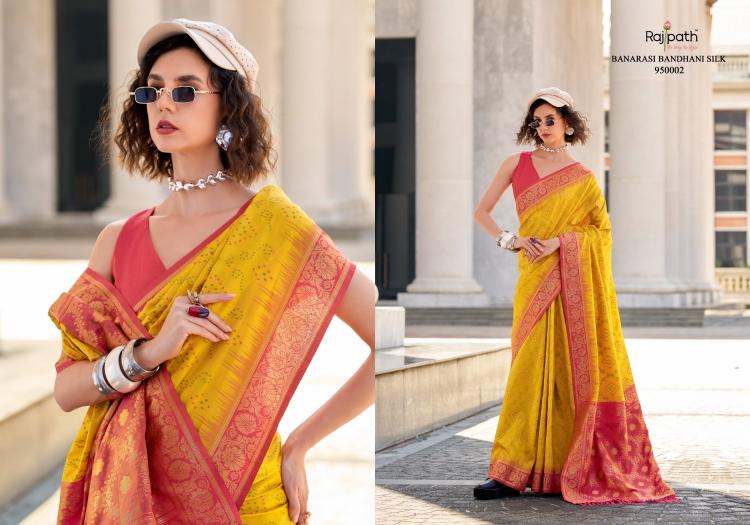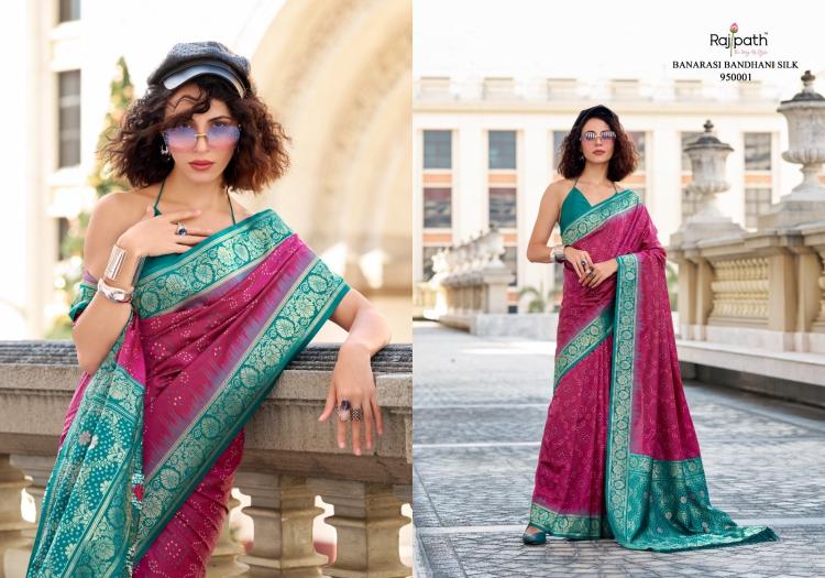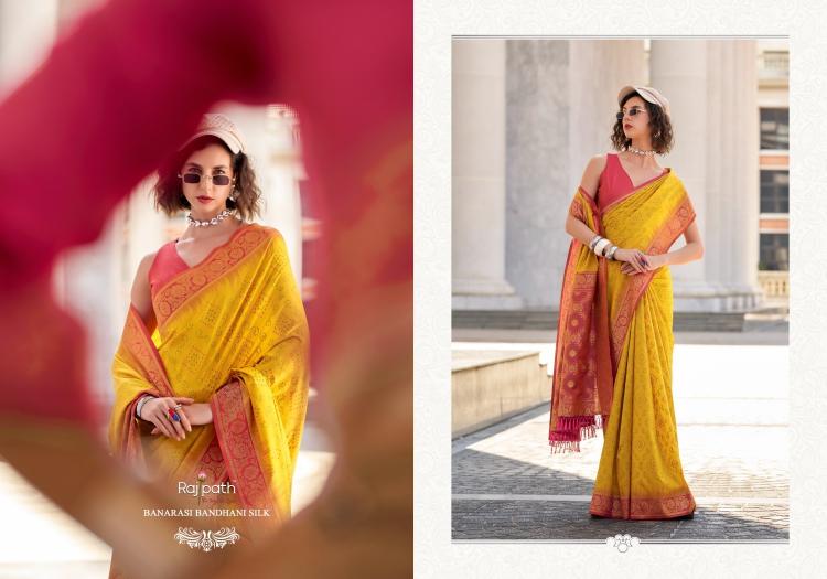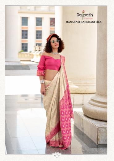 Brand : Rajpath Catalog Name : Zara Silk Series: 950001 To 950007 Saree Fabric :Soft Silk Ikkat Design Bandhani With Weaving Beautiful Border Blouse Fabric : Soft Silk |