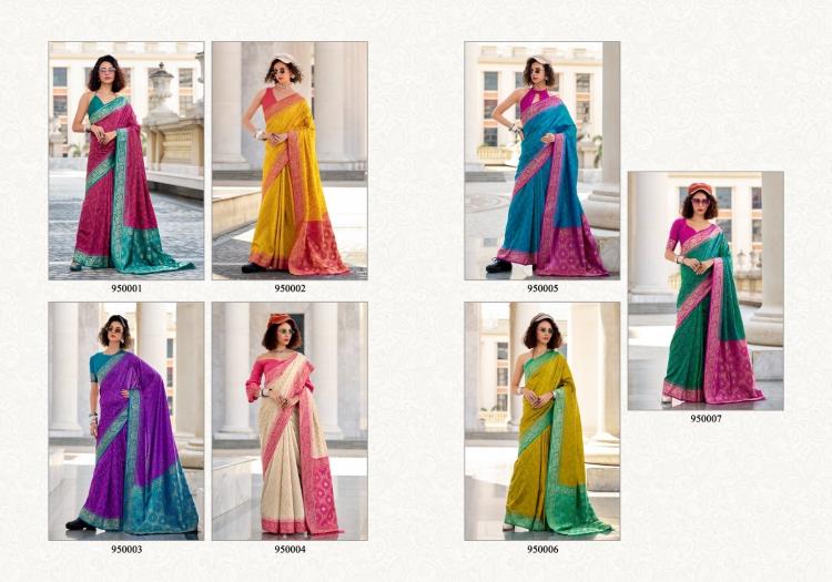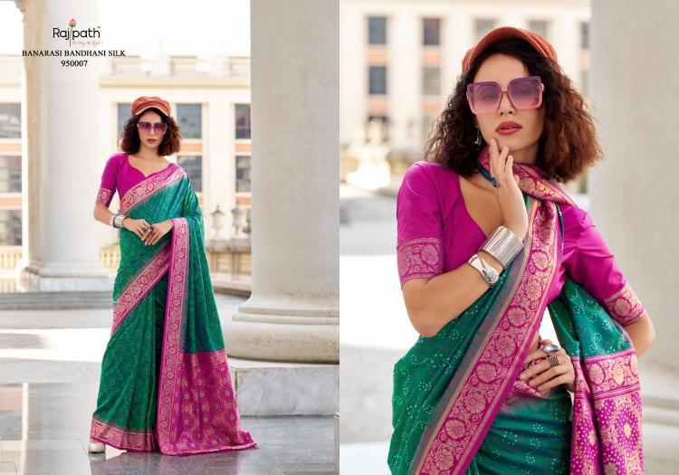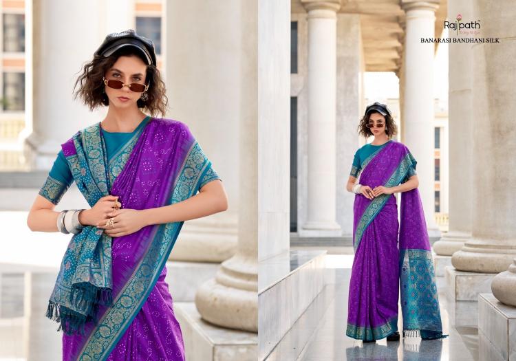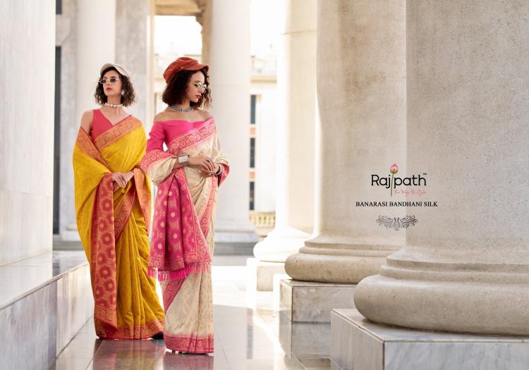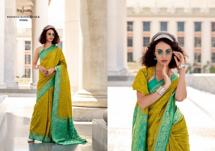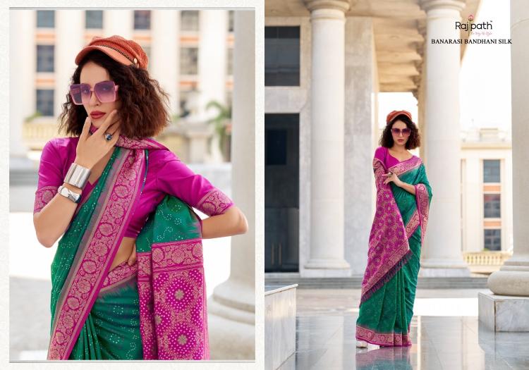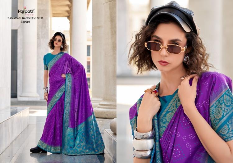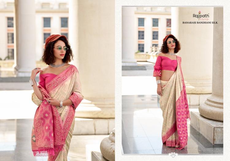 Brand : Rajpath Catalog Name : Zara Silk Series: 950001 To 950007 Saree Fabric :Soft Silk Ikkat Design Bandhani With Weaving Beautiful Border Blouse Fabric : Soft Silk |