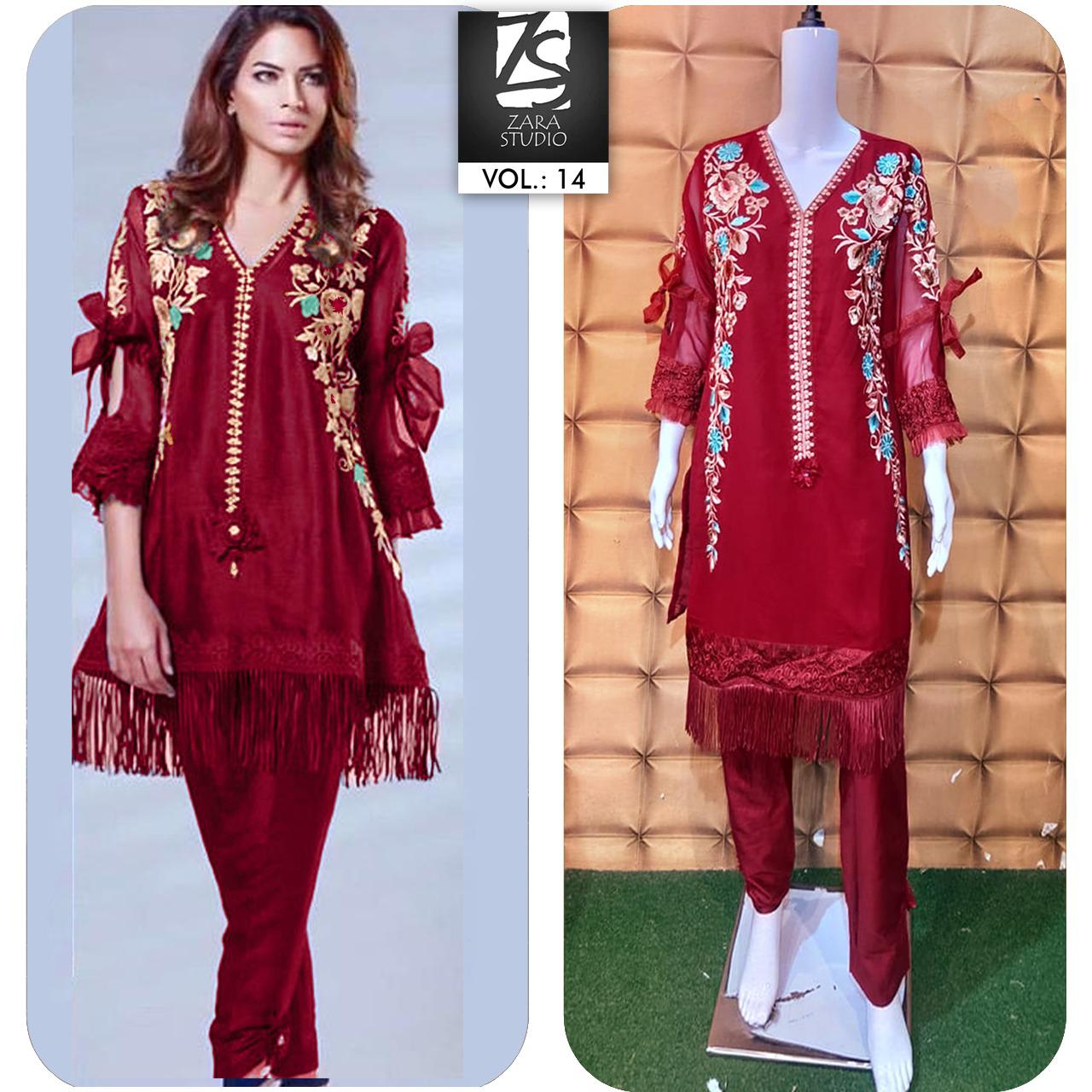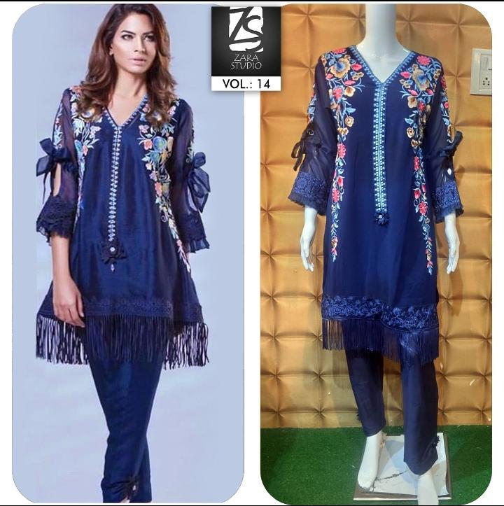 🔥(Z.S :-VOL :- 14)🔥 Look Formal yet Classy in our new Designer collection ➖➖➖➖➖➖➖➖ Present by 💫Zara Studio💫 🌟The Fashion Icon 🌟 ➖➖➖➖➖➖➖➖ 🔴 Description🔴 〰〰〰〰〰〰〰 Designer Luxury Tunic with beautiful classy Embroidery Work With Lace & Flower Work paired with Cigarette pants 🔴 Fabric Details🔴 〰〰〰〰〰〰〰 ✨ Top:- Pure Georget ✨Pant:- Pure Jaam Satin ✨ Colour (1) Navey Blue (2) Maroon ‼️Size Chart‼️ ✨Top XL size chest (42) ✨ Bottom Waist Xl Size (36-42) ✨Top Length(37) ✨ Rate 950/-each ✨ Full Sat Avilable ✨Colour may slightly vary due to light effect✨ 🔴Despatching At Saturday 🔴 |