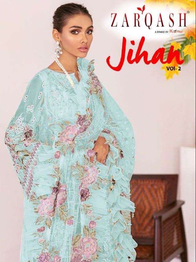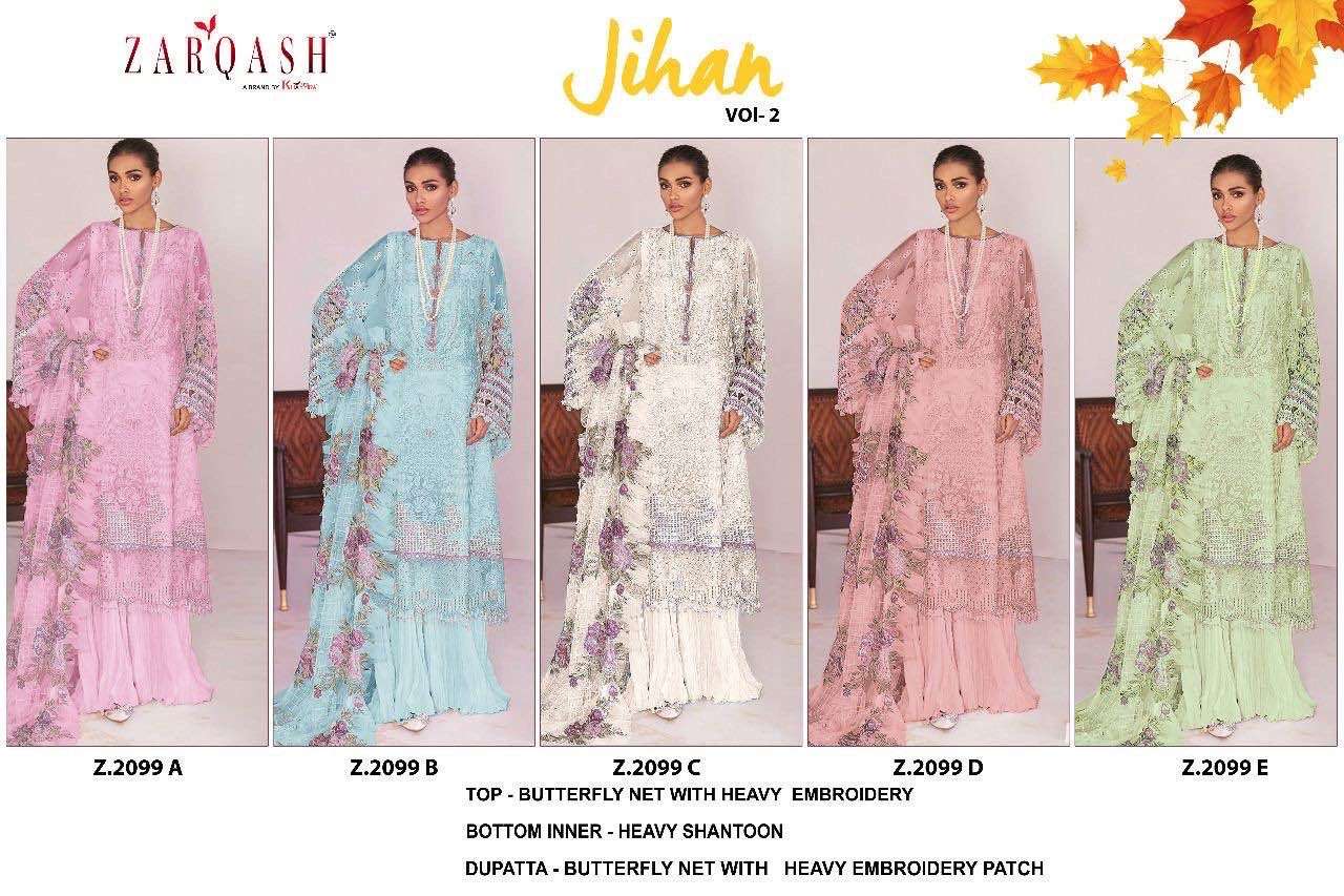 ZARQASH ™️ JIHAN VOL-2 D. No :- Z-2099 TOP - BUTTERFLY NET HEAVY EMBROIDERERY WITH PERAL WORK UNSTITCH INNER BOTTOM - HEAVY SANTOON DUPATTA - BUTTERFLY NET HEAVY EMBROIDERED WITH PATCH 5 PCS IN SET RATE - 1199 ₹ PER PCS + GST DELIVERY - Today |