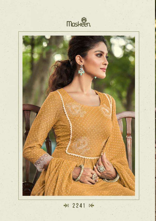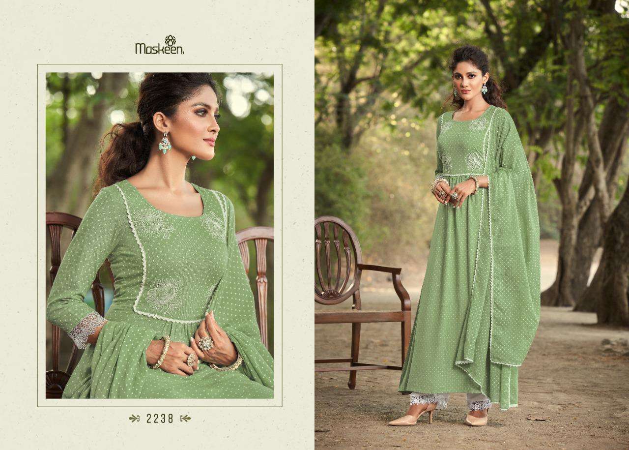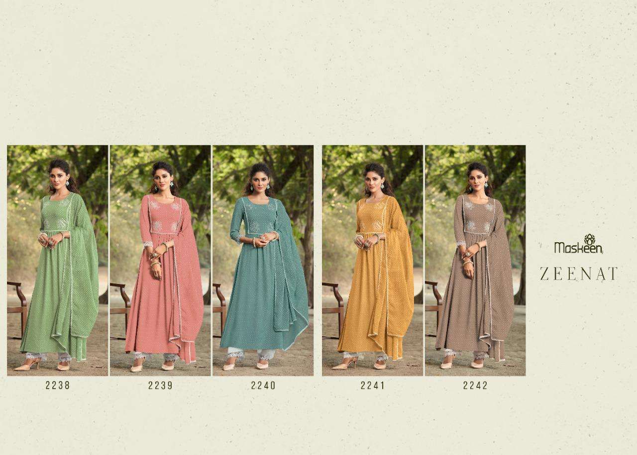 Maskeen ji ZEENAT Beutyfull fresh colours in all time everoneâs favourite folka print * PRICE_1133/-/- FABRICS -----   Top     - * pure rayon print with delicate emboidery work and decorated with kuroshiya lases * Bottom - *premium shantoom silk with  kuroshiya lases work in bottom * â dhupatta ~pure mal with print and kuroshiya lases bottom is optional Typeâ  readymade Sizes â * M L XL XXL 3XL* Set to set Delivery 4-5 days |
