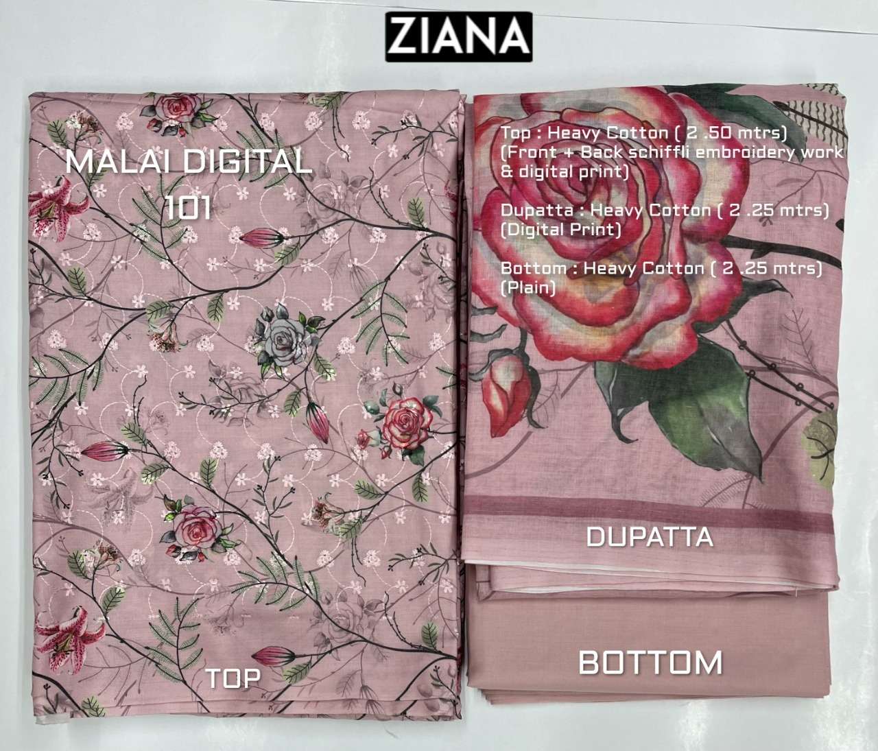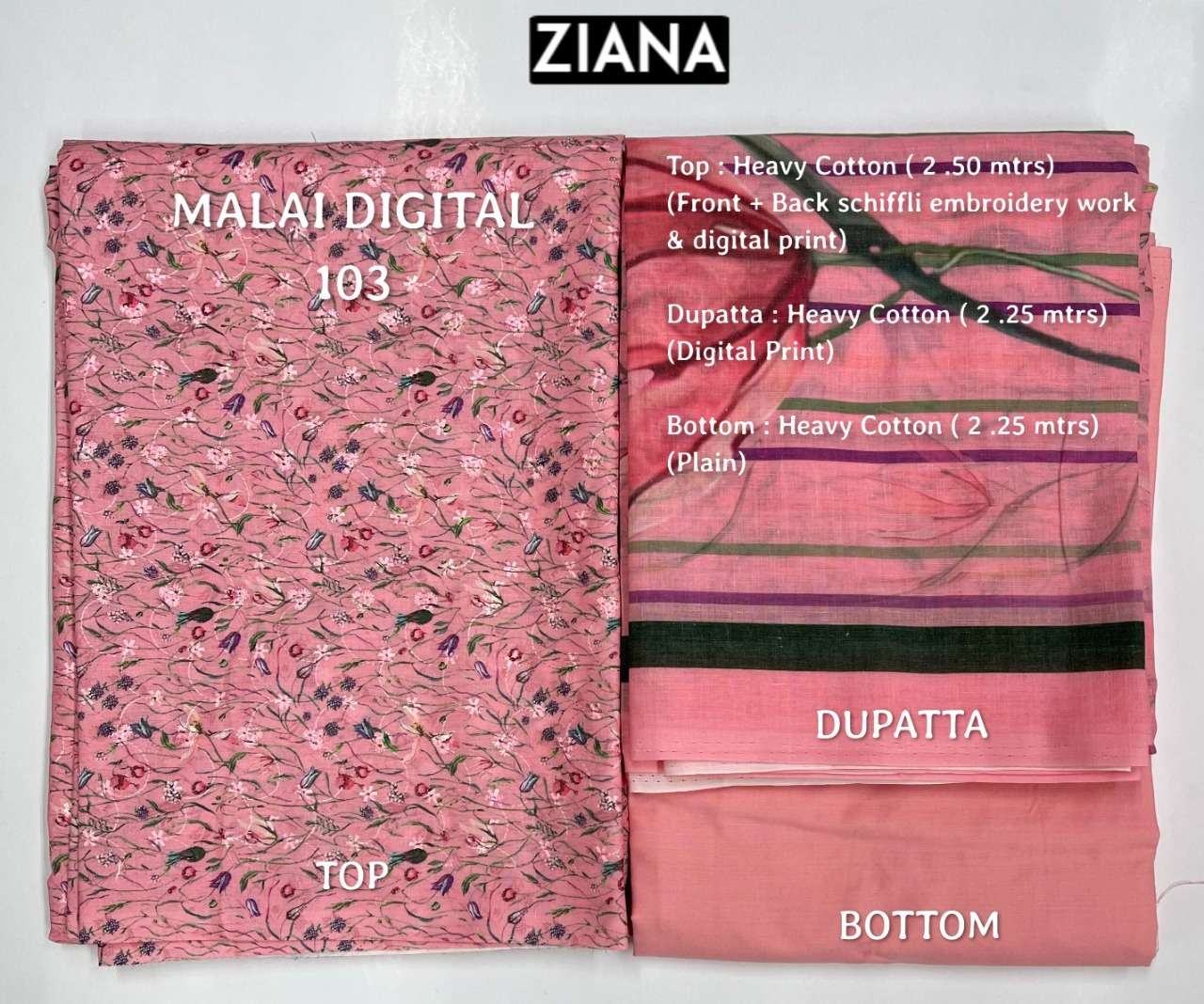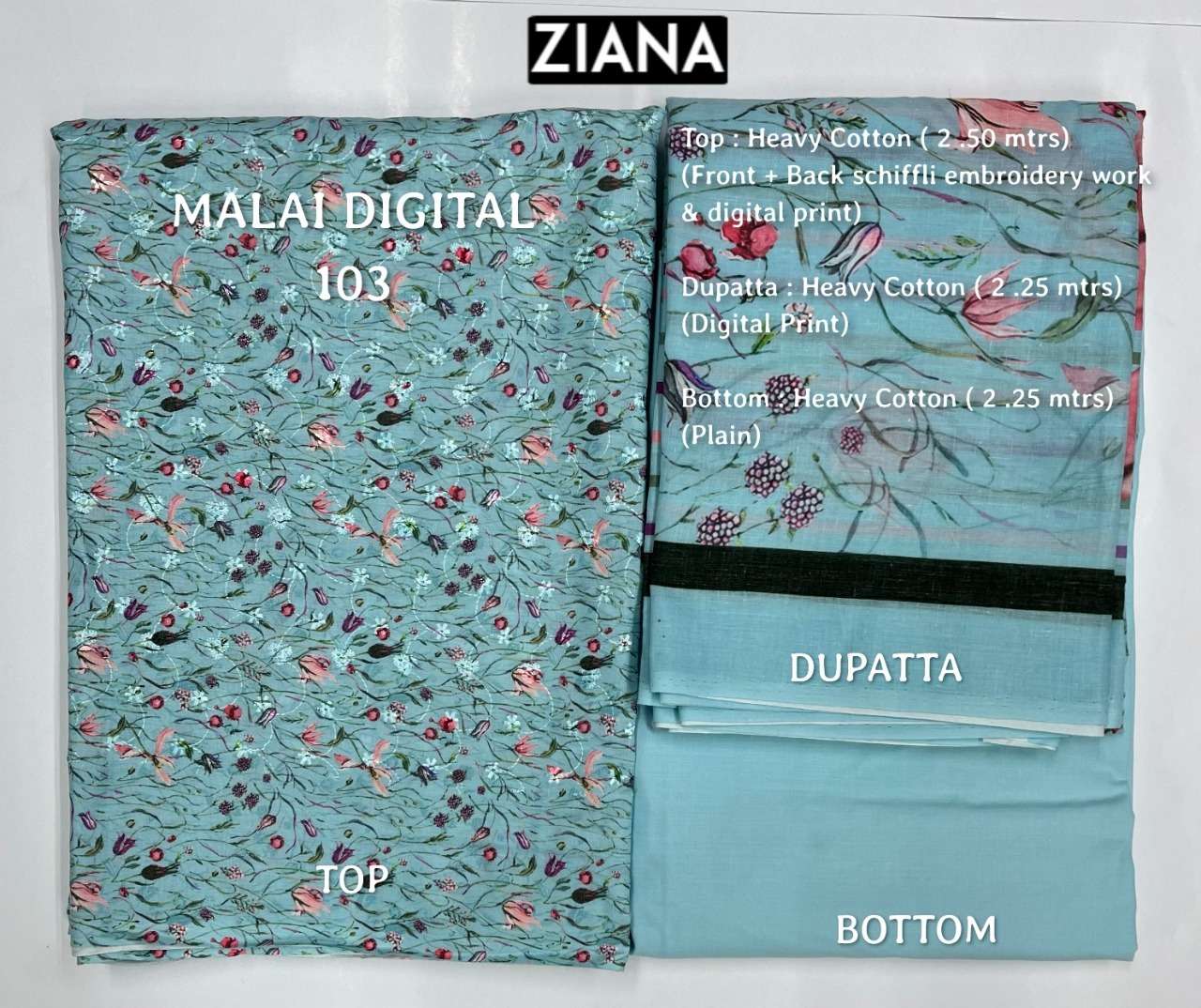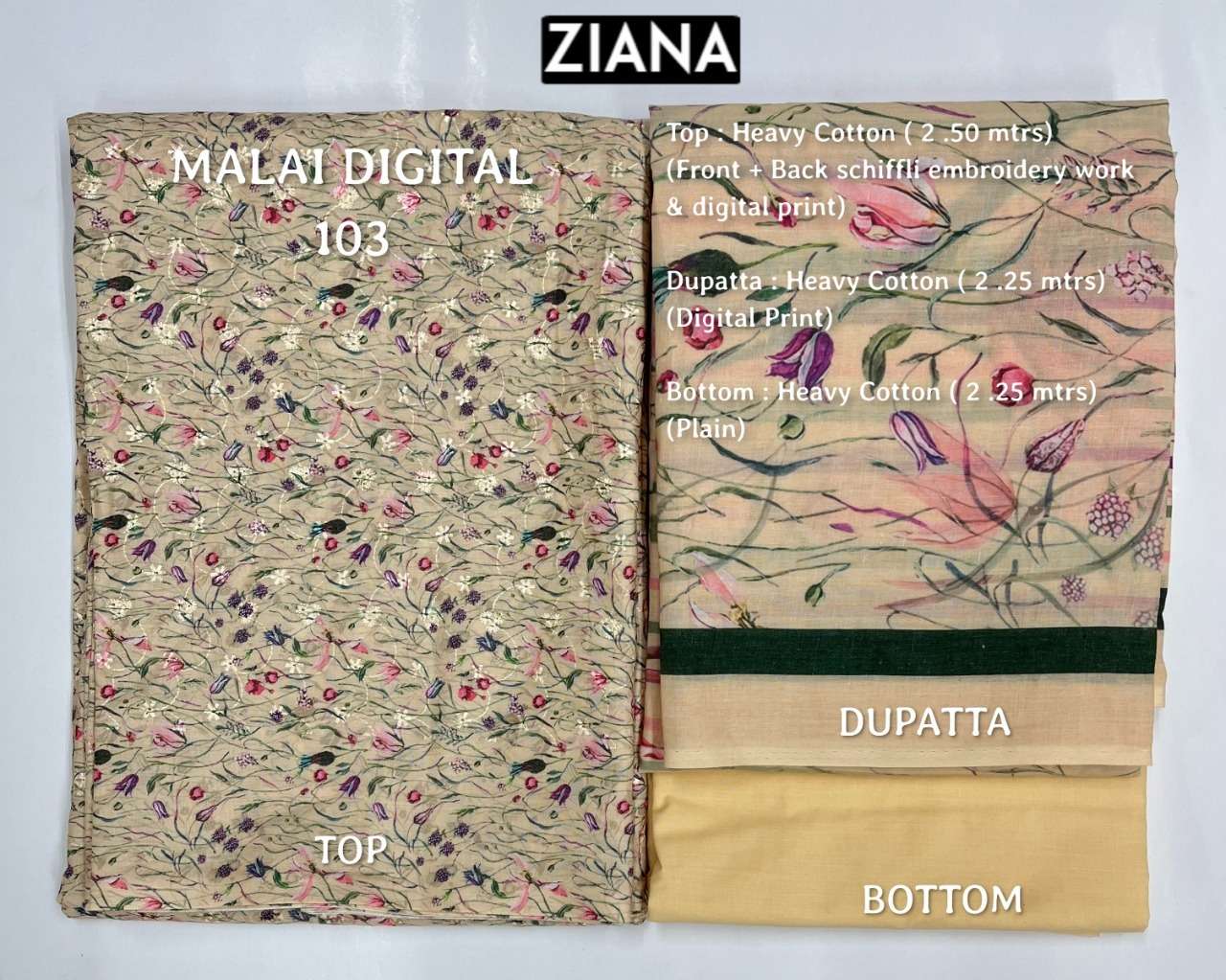 Brand : ZIANA Name : MALAI DIGITAL 103 Details : Heavy Cotton schiffli embroidery best quality work and digital print unstitched suit dress material. Top : Heavy Cotton ( 2 .50 mtrs) Dupatta : Heavy Cotton ( 2 .25 mtrs) Bottom : Heavy Cotton (Plain) ( 2 .25 mtrs) 1 set = 4 pcs Rate : ₹625/- Best Quality Assured. |