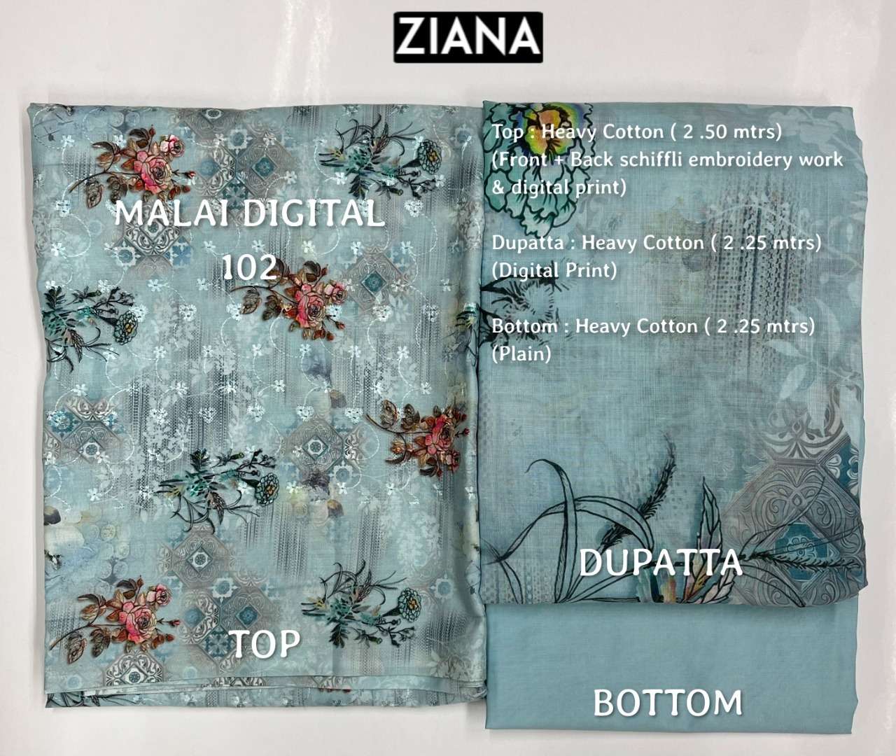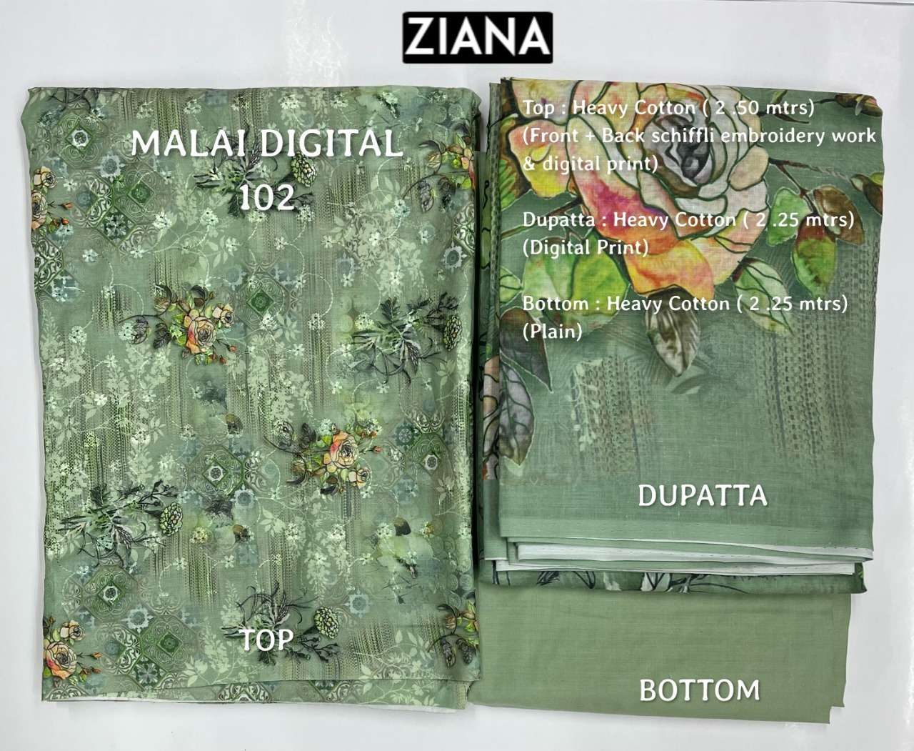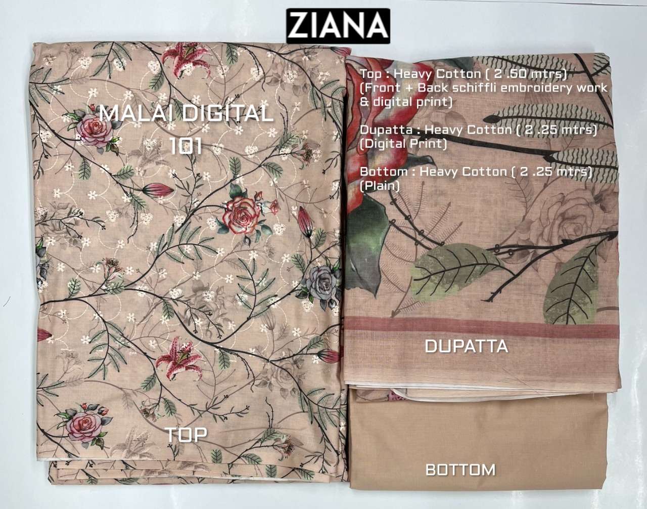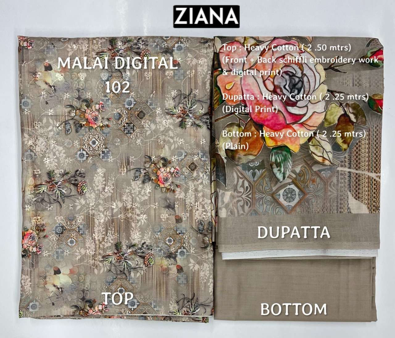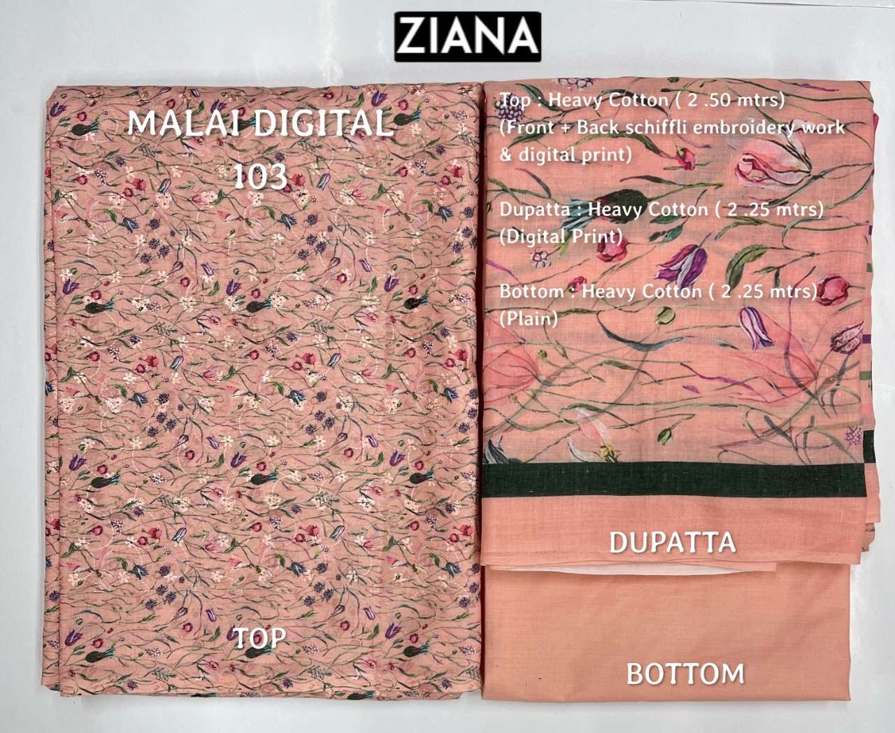 Brand : ZIANA Name : MALAI DIGITAL 103 Details : Heavy Cotton schiffli embroidery best quality work and digital print unstitched suit dress material. Top : Heavy Cotton ( 2 .50 mtrs) Dupatta : Heavy Cotton ( 2 .25 mtrs) Bottom : Heavy Cotton (Plain) ( 2 .25 mtrs) 1 set = 4 pcs Rate : ₹625/- Best Quality Assured. |