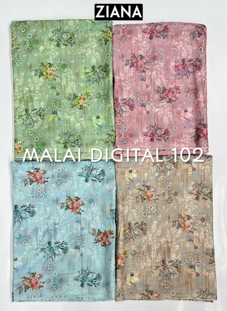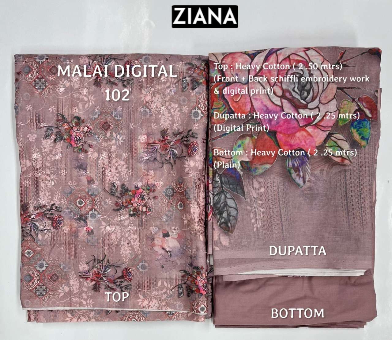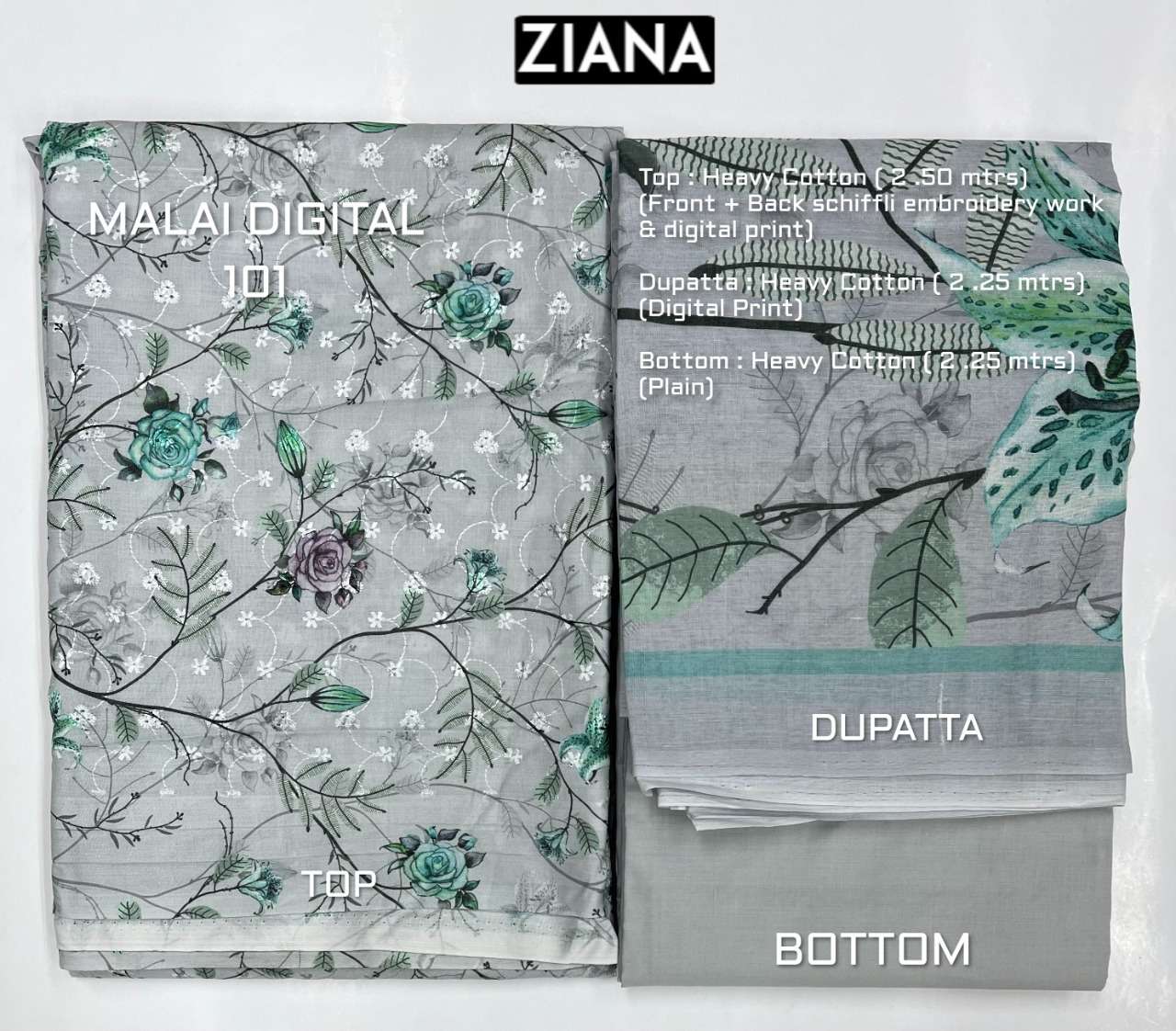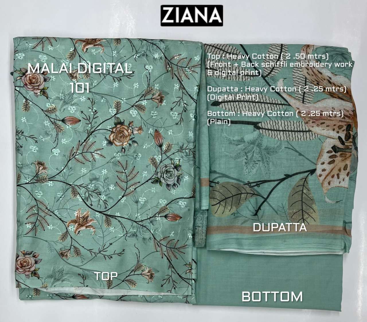 Brand : ZIANA Name : MALAI DIGITAL 103 Details : Heavy Cotton schiffli embroidery best quality work and digital print unstitched suit dress material. Top : Heavy Cotton ( 2 .50 mtrs) Dupatta : Heavy Cotton ( 2 .25 mtrs) Bottom : Heavy Cotton (Plain) ( 2 .25 mtrs) 1 set = 4 pcs Rate : ₹625/- Best Quality Assured. |