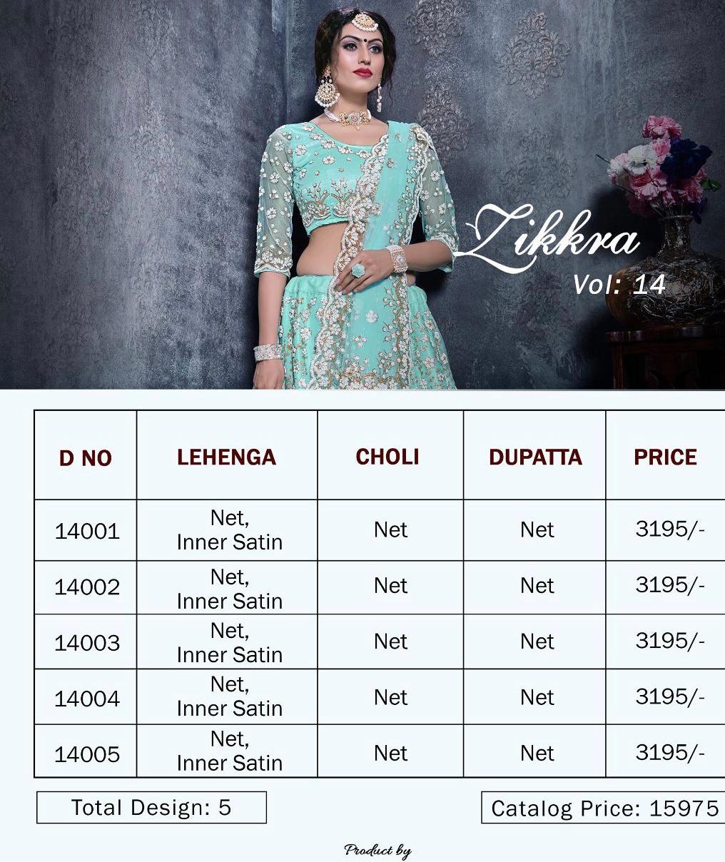 Zikkra Vol 14 14001-14005 Series Heavy Designer Net Embroidered Lehenga Wholesaler