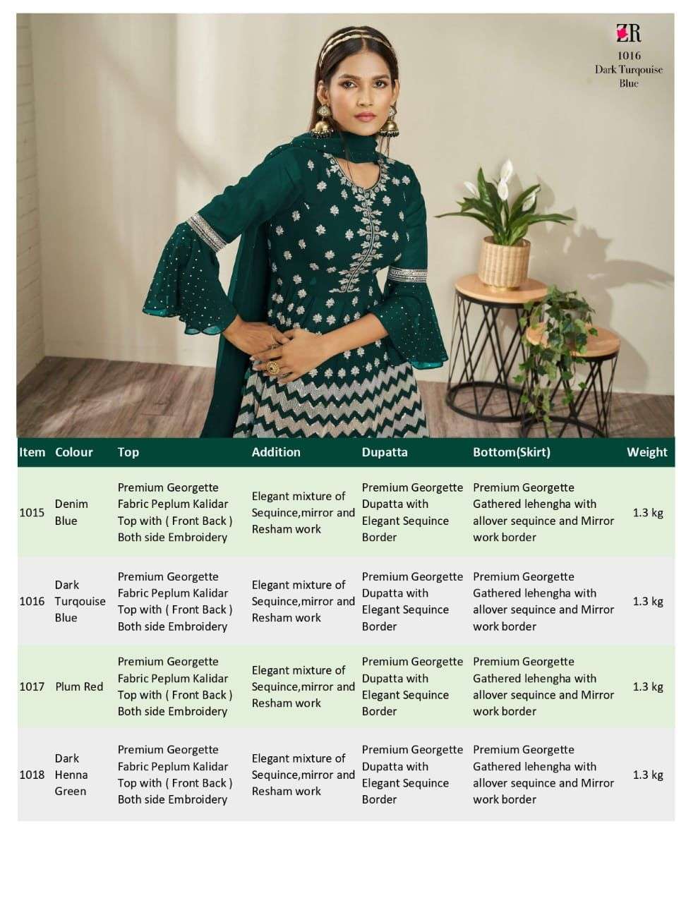 ZR V5 Festive Collection (1015-18) 4 Different Festive Colours CatLog Name: ZR 1015-18 Fabric: Premium Georgette Fabric Addition: Sequences, mirror and Resham embroidery and Swarovski work in both (front-back) side. Per set: 4 pcs Avg. Price 2695.00 INR FREE SIZE Semi Stitched Semi stitch Top Height: 38" (Can be short as per consumer's demand) Ready to dispatch |