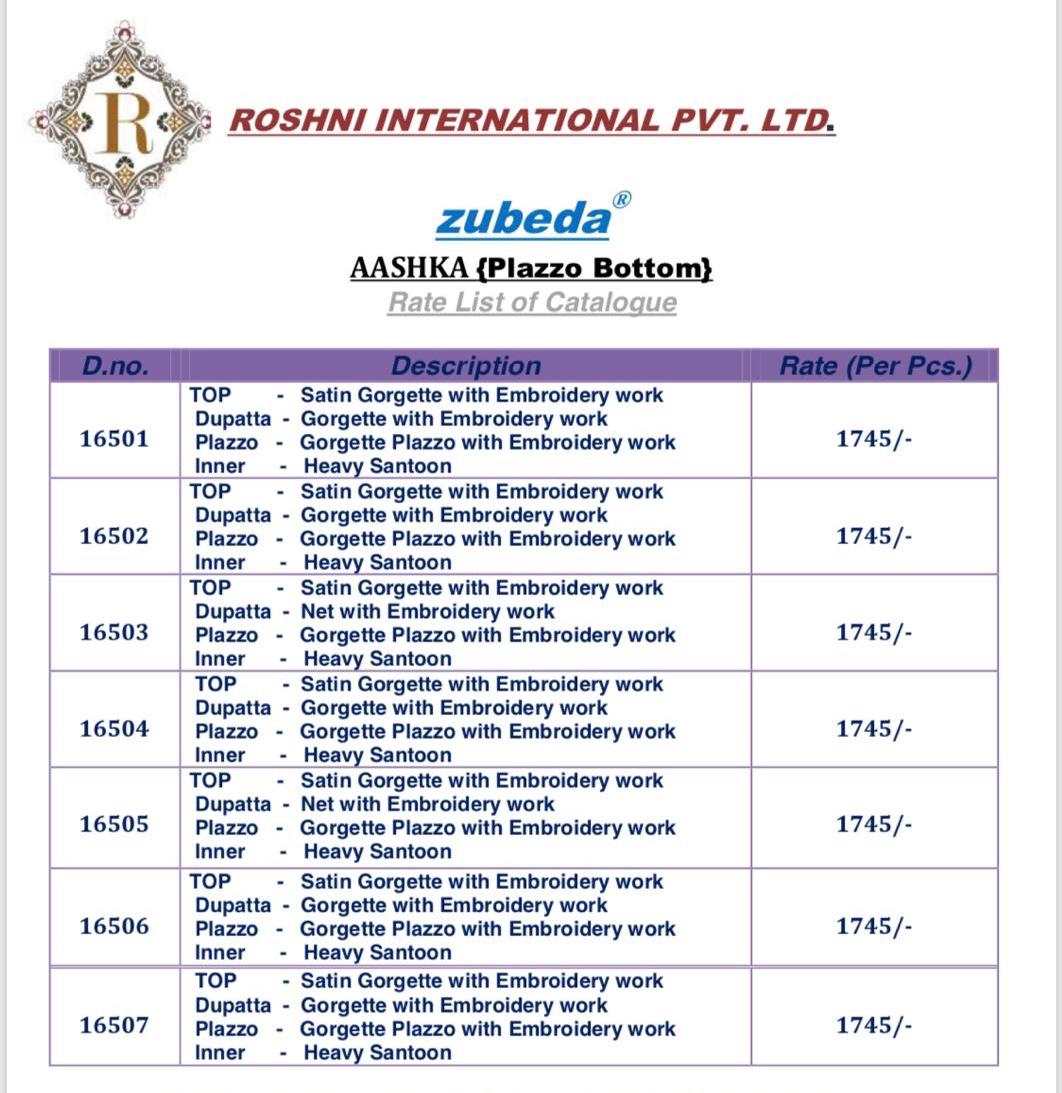 Brand - Zubeda . Catlog Name - AASHKA . Set To Set . GST 5 Percent Extra. Delivery from 2-3 days |