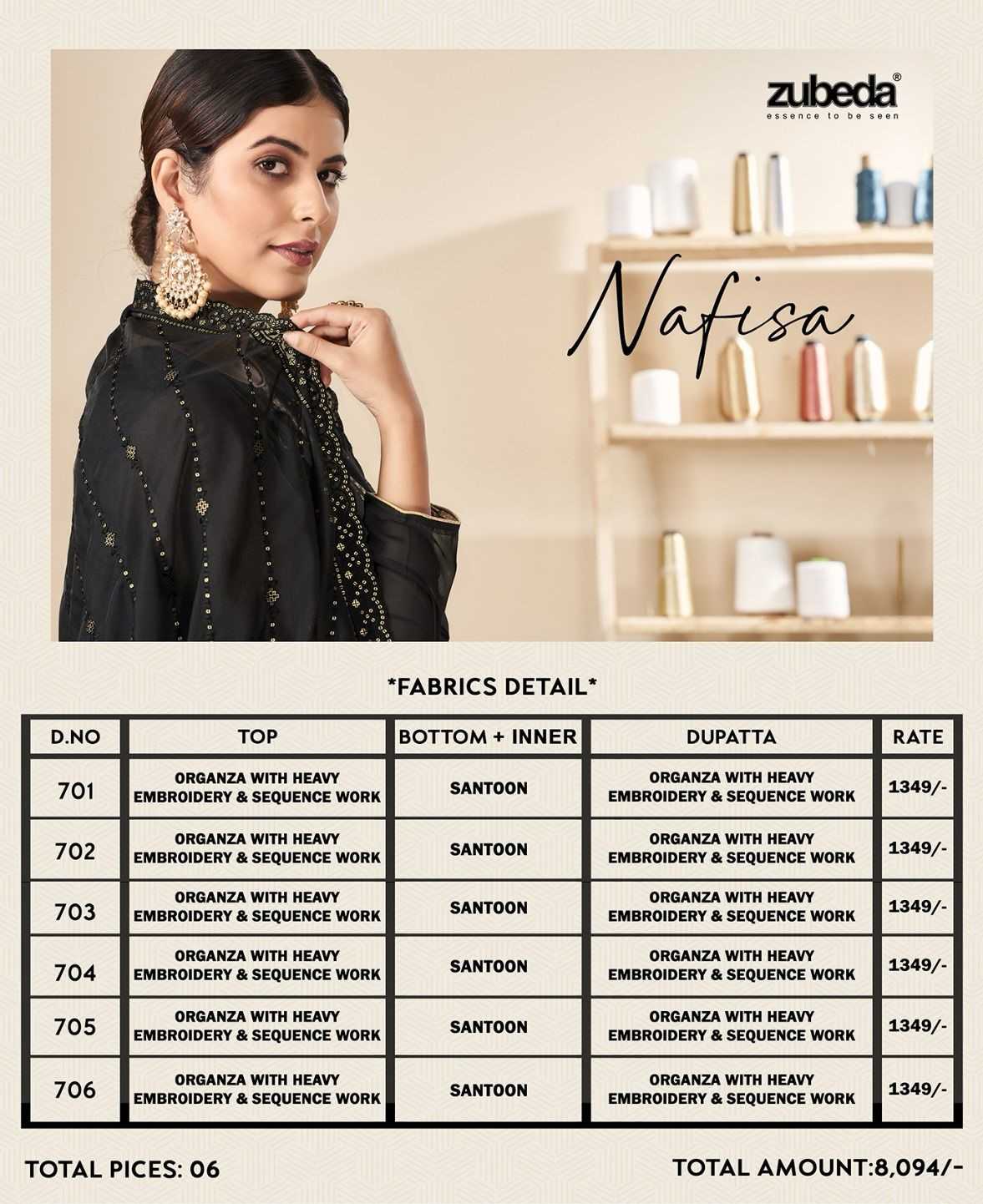 ZUBEDA PRESENT NAFISA DESIGN : 6 RATE : 1349 SALWAR KAMEEZ ORGANZA WITH HEAVY EMBROIDERY AND SEQUENCE WORK |
