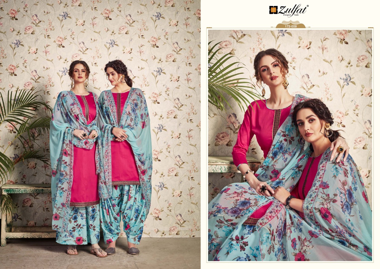 âÂÂZulfat Designer Suitsâ Presents "MOHINI" Vol-2 Top: 100% Pure Heavy Jam Cotton with Elegantly stitched Kashmiri style Tie and daman stiched Lace. (2.50 mtrs) Dupatta: Pure Nazneen dupatta with four side lace (2.30 mtr) Bottom: Pure soft cotton printed salwar (3 mtrs apx) Pcs: 10 Rate: 395 /- (GST extra) |