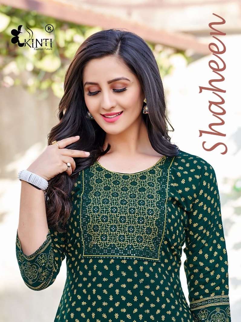 kinti present shaheen fancy foil print readymade straight kurti and sharara collection