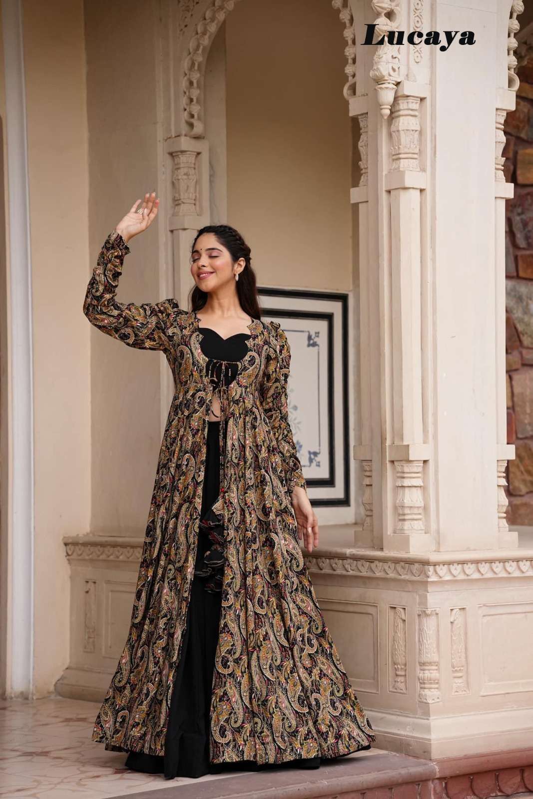 sayuri designer mahotsav gold full stitch chinon silk with shrug indo western dress